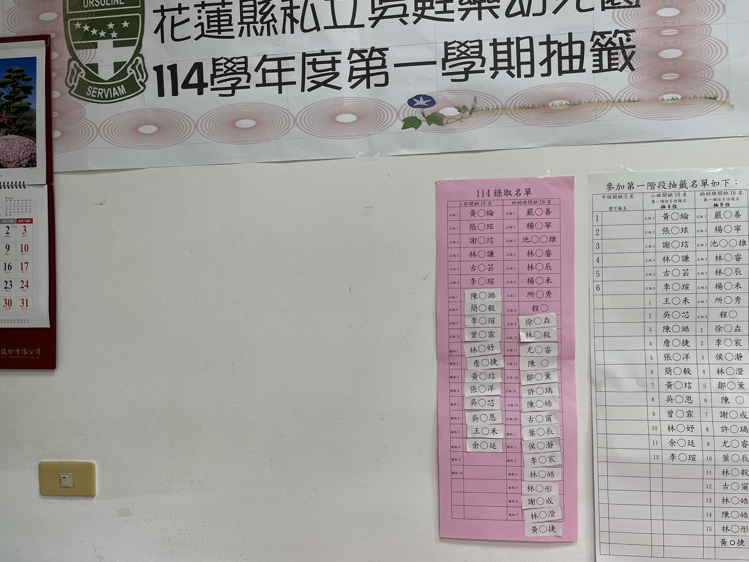 以下名單將於 5/6 上午 10:00 現場公開 抽籤正備取名單 幼班第一順位6名,第二順位 15共計 21名 ※開缺 8 位名額~報名人數超過開缺人數採公開抽籤。 |